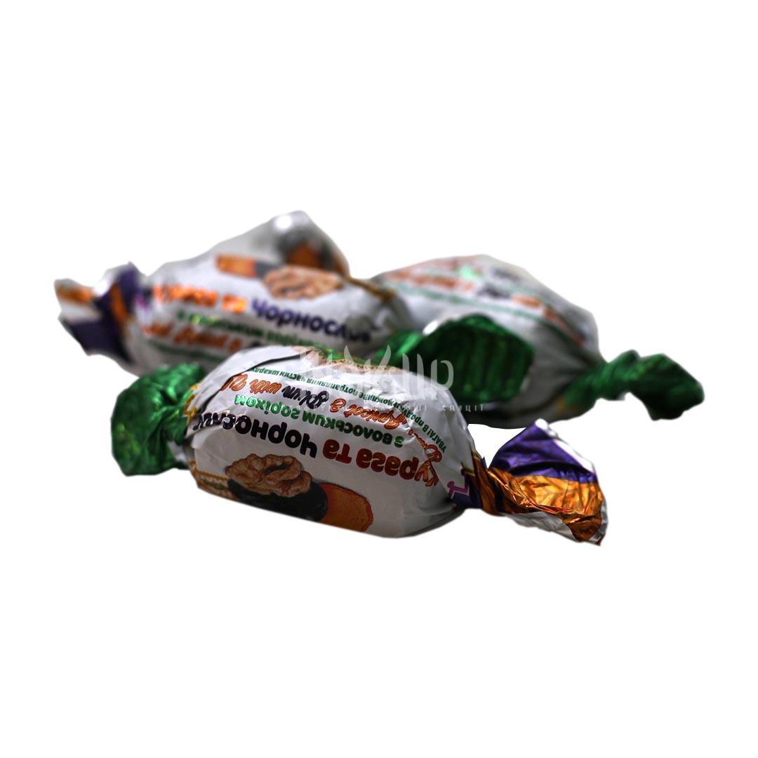 Вид: шоколадні цукерки з чорносливом та горіхом. Смак: солодкий чорнослив з горіховою ноткою. Консистенція: ніжна шоколадна оболонка з хрумким горіхом.