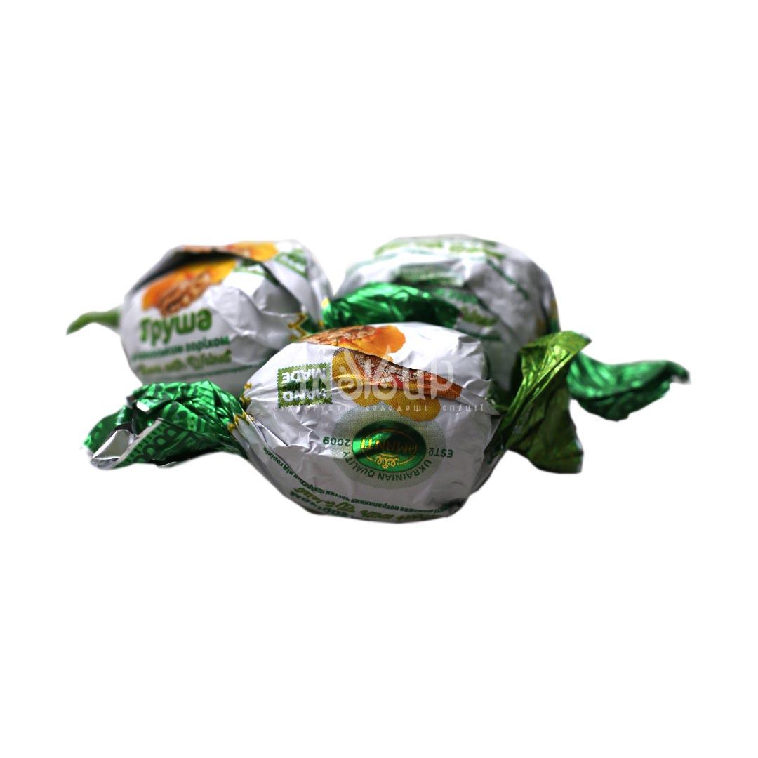 Вид: цукерки з фруктовою начинкою та горіхом. Смак: солодка груша з горіховими нотками. Консистенція: ніжна шоколадна оболонка, хрумкий горіх.