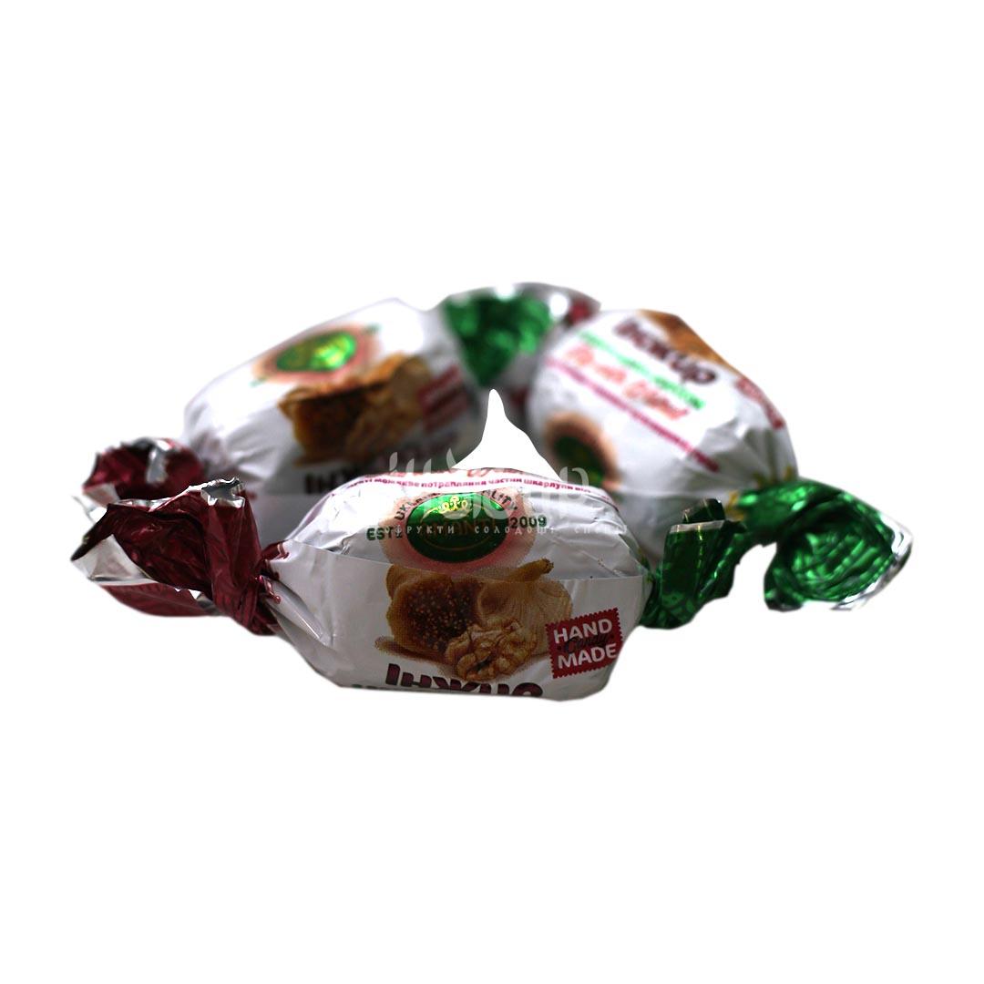 Вид: шоколадні цукерки з інжиром та горіхом. Смак: інжир з горіховою ноткою. Консистенція: ніжна шоколадна оболонка, хрумкий горіх.